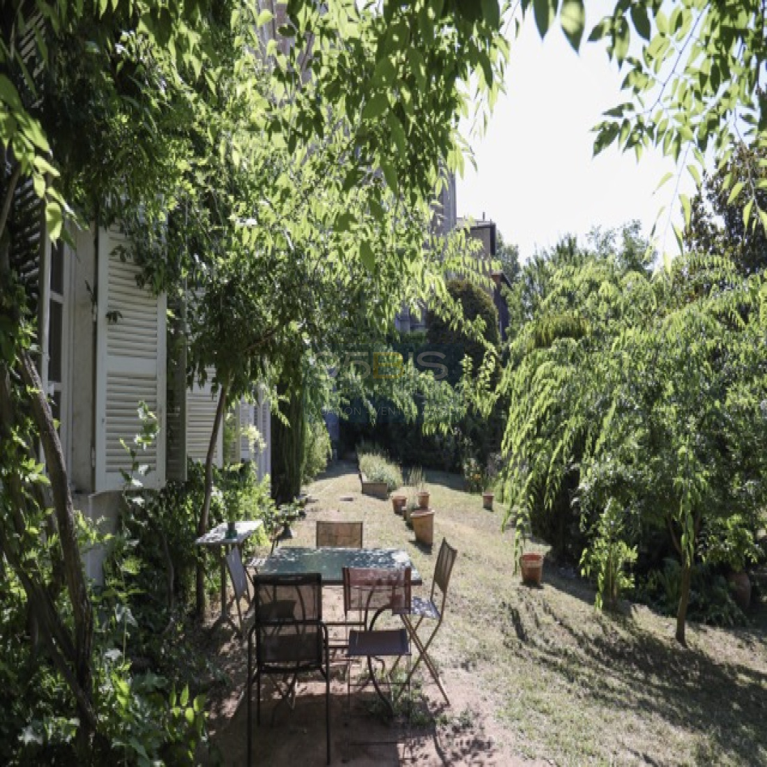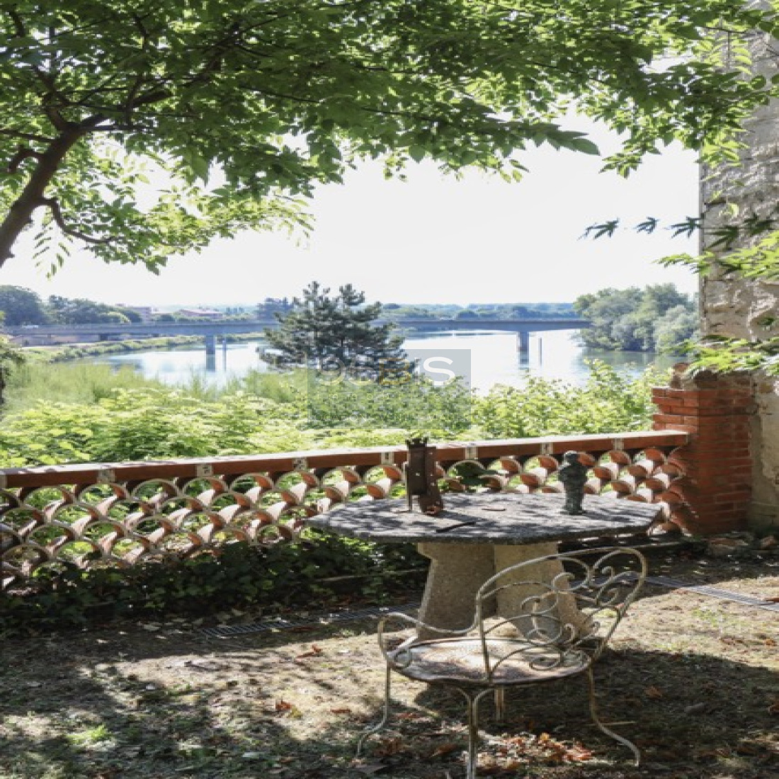 Côté jardin : parcelle d’une superficie totale de 1454m2. Jardin orienté entièrement sur la Saône avec une cuisine d’été, abritée d’une tonnelle couverte de glycines, et équipée d’un four à pain et d’un BBQ maçonné ; et un bassin.